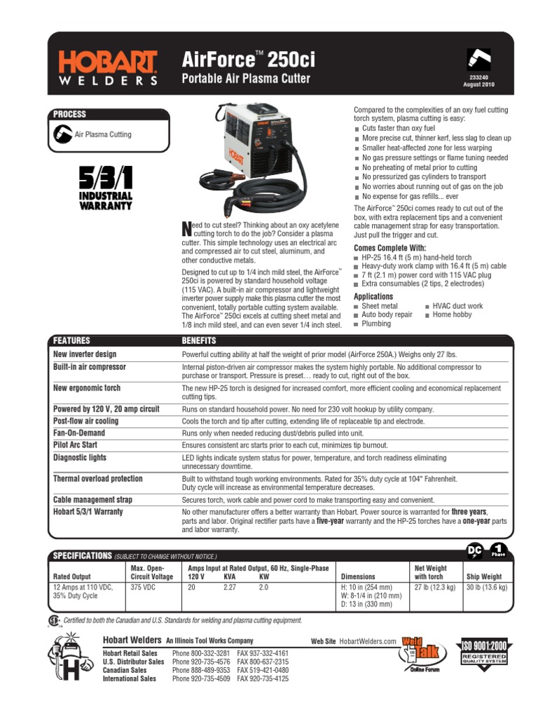 The completely redesigned hobart airforce 27i produces up to 30 amps of cutting power and operates on either 120 volt or 240 input.